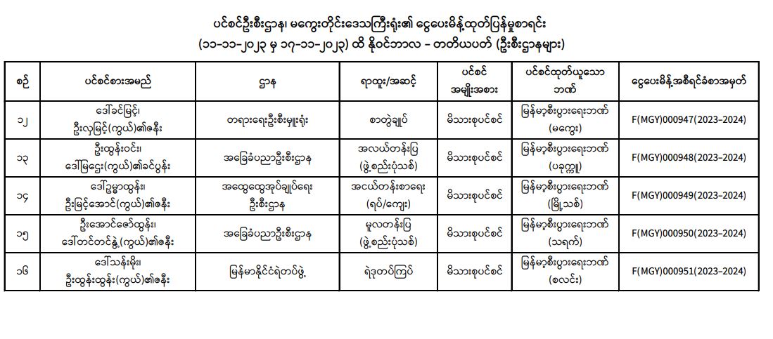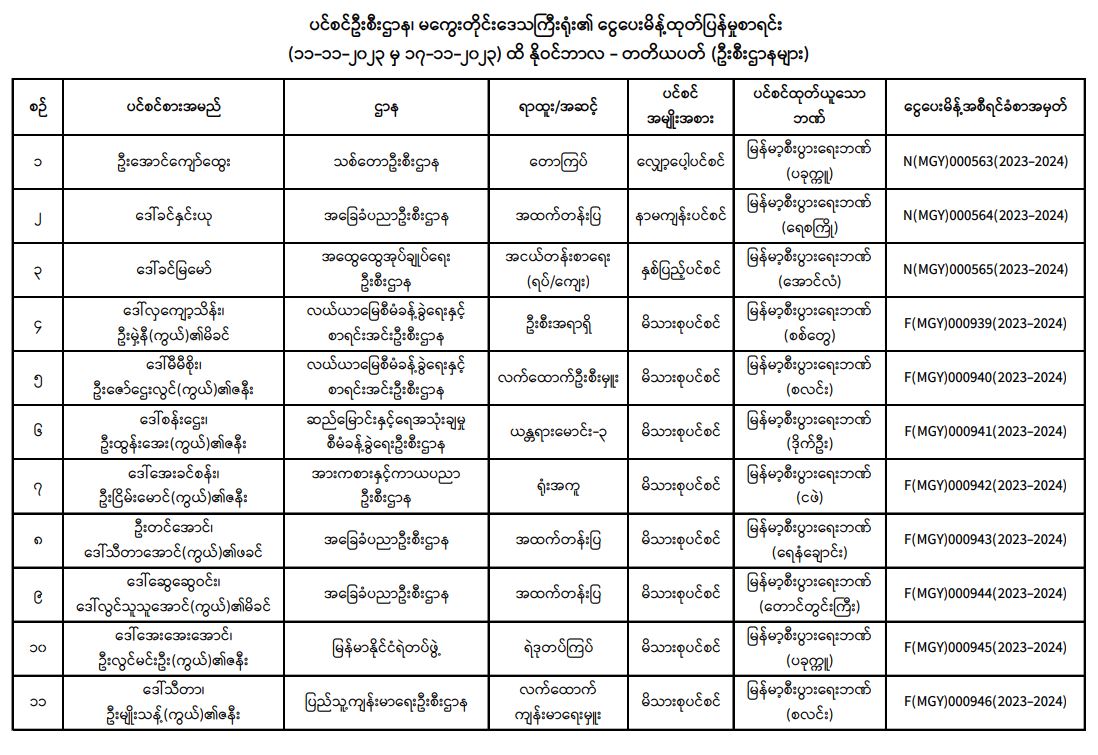 ပင်စင်ဦးစီးဌာန၊ မကွေးတိုင်းဒေသကြီးဦးစီးမှူးရုံး၏ ငွေပေးမိန့်ထုတ်ပြန်မှုစာရင်း (၁၁-၁၁-၂၀၂၃ မှ ၁၇-၁၁-၂၀၂၃) pdfinance_editor Mon, 11/20/2023 - 14:26