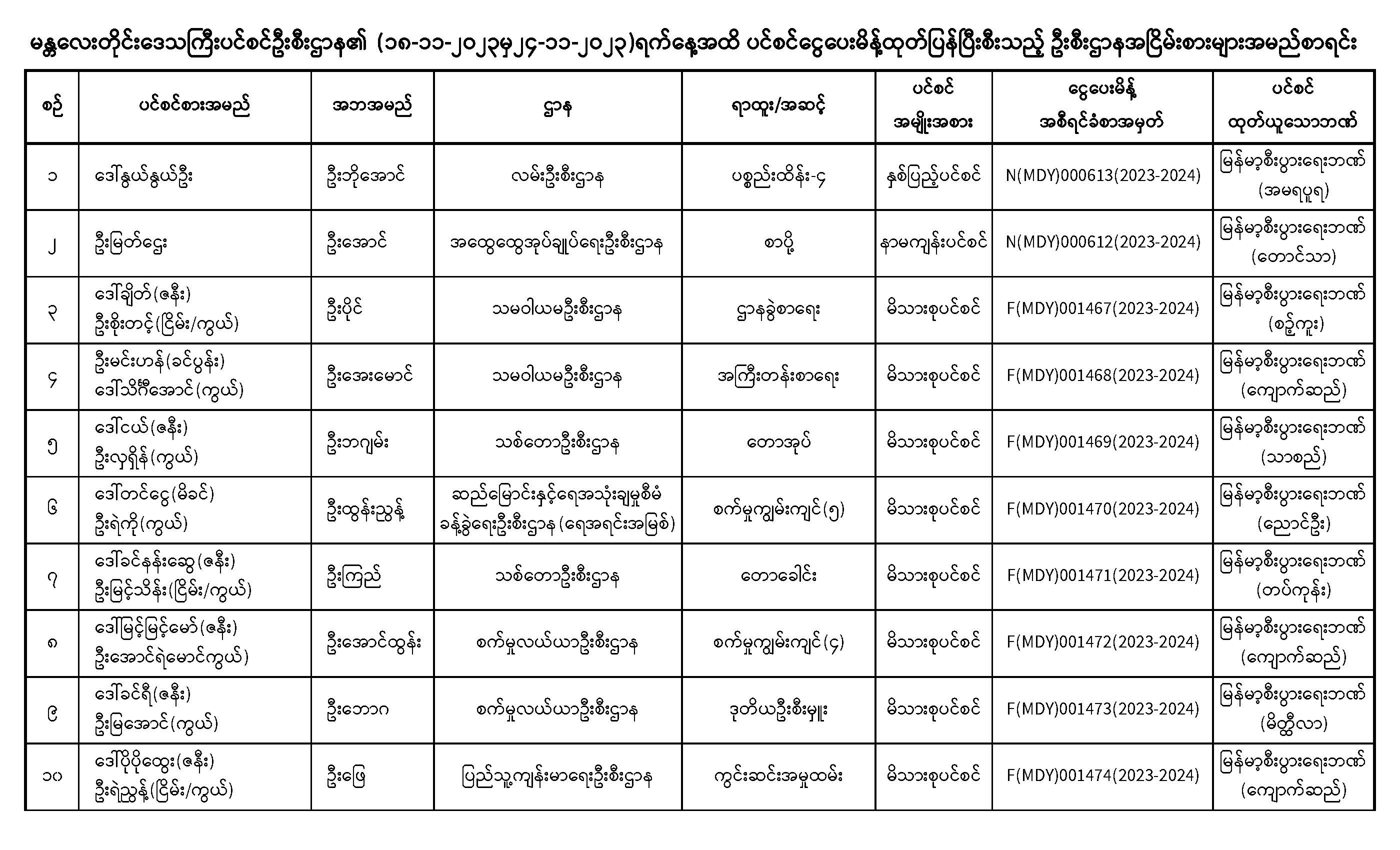 ပင်စင်ဦးစီးဌာန၊ မန္တလေးတိုင်းဒေသကြီးဦးစီးမှူးရုံး၏ ငွေပေးမိန့်ထုတ်ပြန်မှုစာရင်း (၁၈-၁၁-၂၀၂၃ မှ ၂၄-၁၁-၂၀၂၃) pdfinance_editor Tue, 11/21/2023 - 11:28