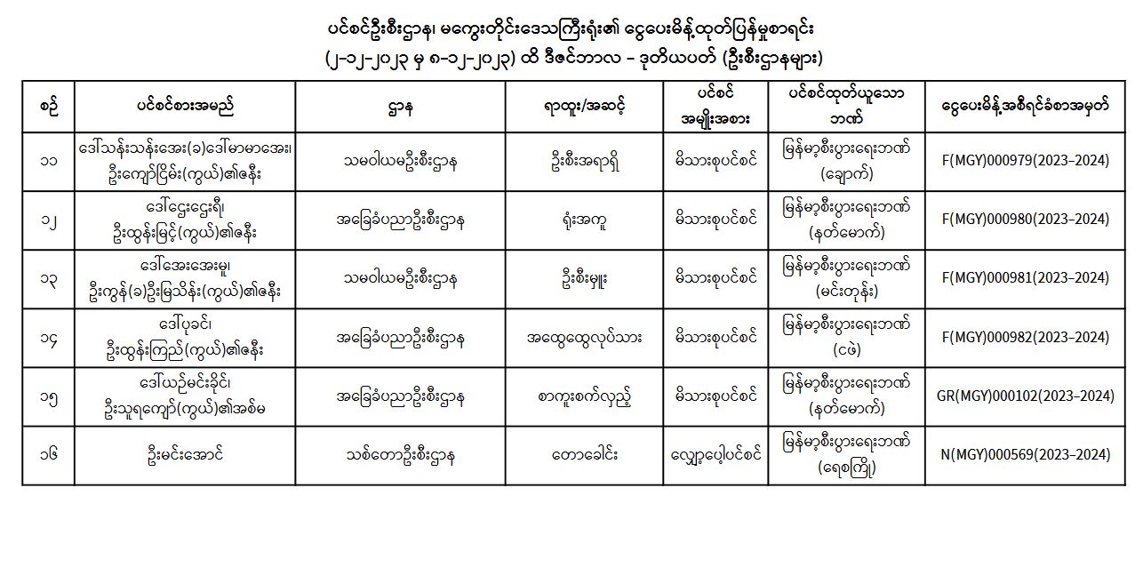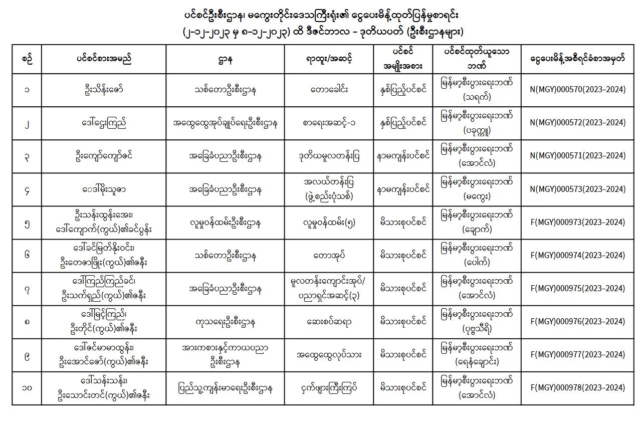 ပင်စင်ဦးစီးဌာန၊ မကွေးတိုင်းဒေသကြီးဦးစီးမှူးရုံး၏ ငွေပေးမိန့်ထုတ်ပြန်မှုစာရင်း (၂-၁၂-၂၀၂၃ မှ ၈-၁၂-၂၀၂၃) pdfinance_editor Mon, 12/11/2023 - 11:40