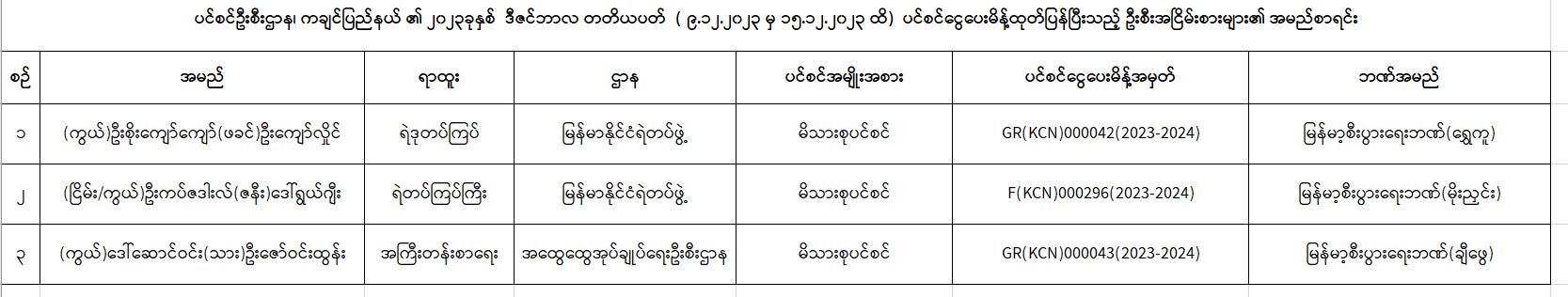 ပင်စင်ဦးစီးဌာန၊ ကချင်ပြည်နယ်ဦးစီးမှူးရုံး၏ ငွေပေးမိန့်ထုတ်ပြန်မှုစာရင်း (၉-၁၂-၂၀၂၃ မှ ၁၅-၁၂-၂၀၂၃ ထိ) pdfinance_editor Fri, 12/15/2023 - 14:17