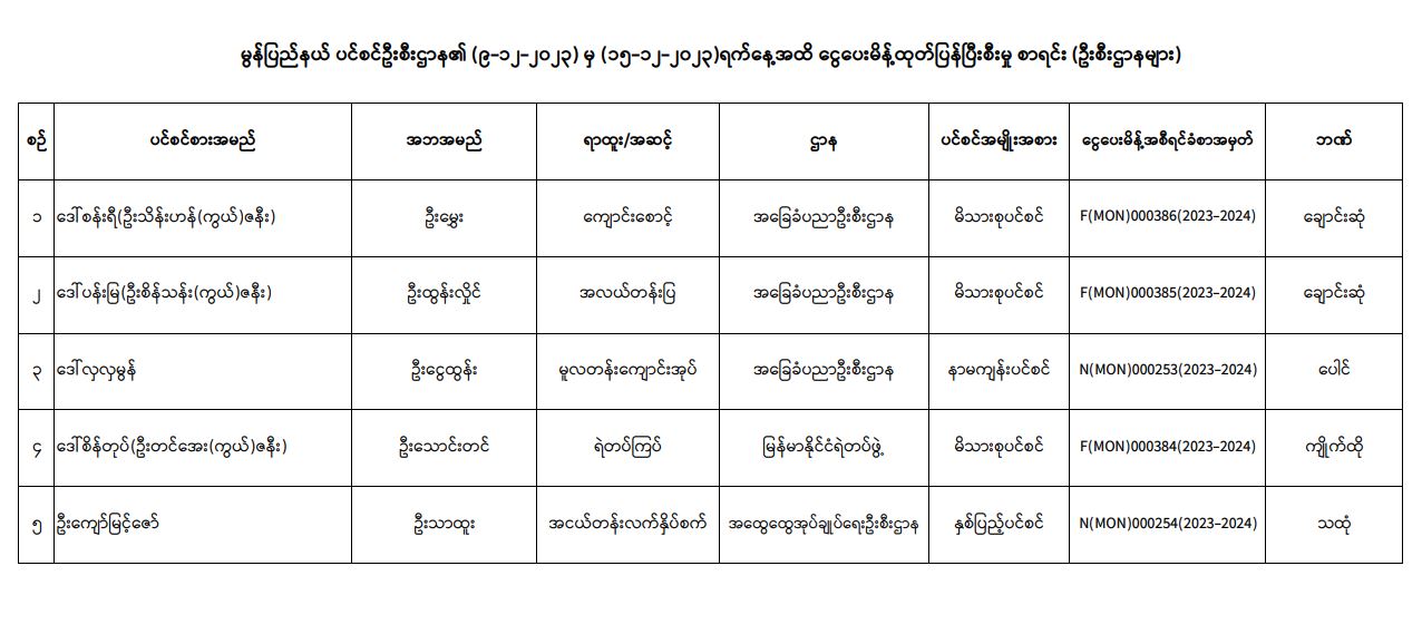 ပင်စင်ဦးစီးဌာန၊ မွန်ပြည်နယ်ဦးစီးမှူးရုံး၏ ငွေပေးမိန့်ထုတ်ပြန်မှုစာရင်း (၉-၁၂-၂၀၂၃ မှ ၁၅-၁၂-၂၀၂၃) pdfinance_editor Wed, 12/20/2023 - 13:01