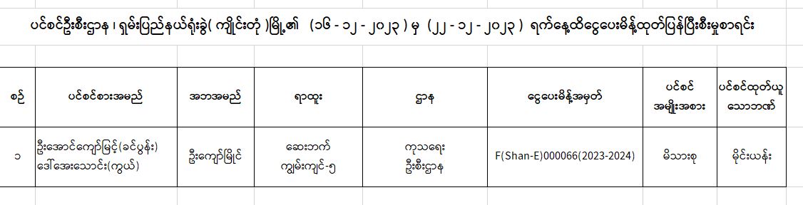 ပင်စင်ဦးစီးဌာန၊ ရှမ်းပြည်နယ်ရုံးခွဲ(ကျိုင်းတုံမြို့)၏ ငွေပေးမိန့်ထုတ်ပြန်မှုစာရင်း (၁၆-၁၂-၂၀၂၃ မှ ၂၂-၁၂-၂၀၂၃) pdfinance_editor Fri, 12/22/2023 - 12:37