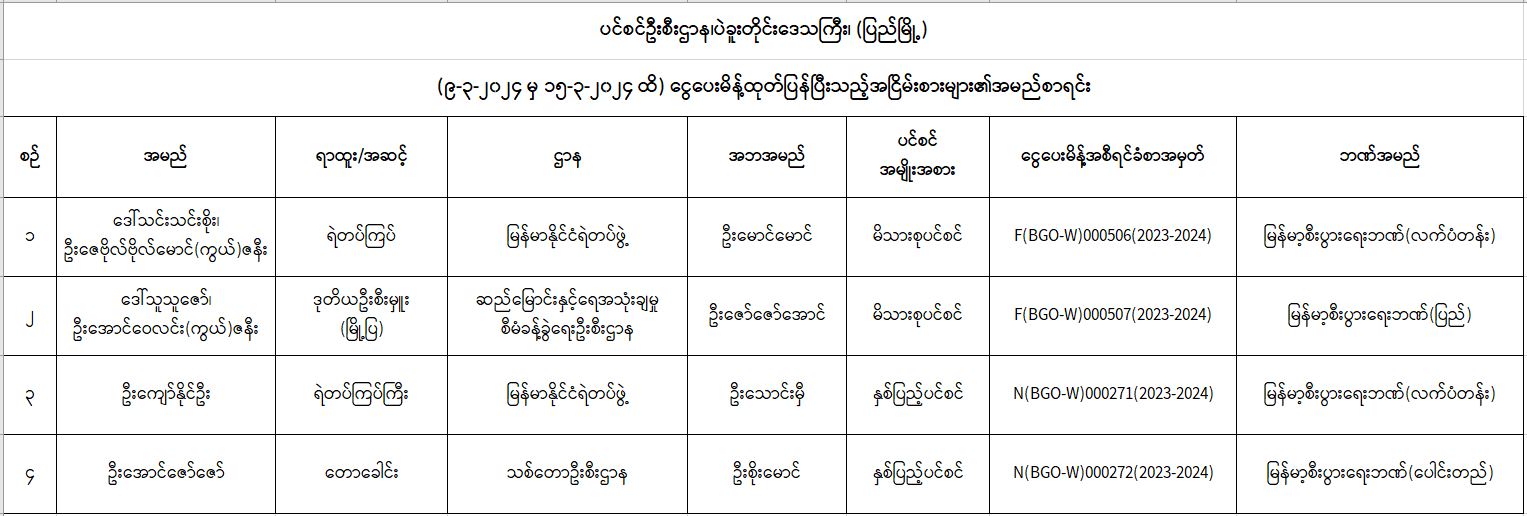 ပင်စင်ဦးစီးဌာန၊ ပဲခူးတိုင်းရုံးခွဲ(ပြည်မြို့)၏ ငွေပေးမိန့်ထုတ်ပြန်မှုစာရင်း (၉-၃-၂၀၂၄ မှ ၁၅-၃-၂၀၂၄) pdfinance_editor Thu, 03/21/2024 - 15:55