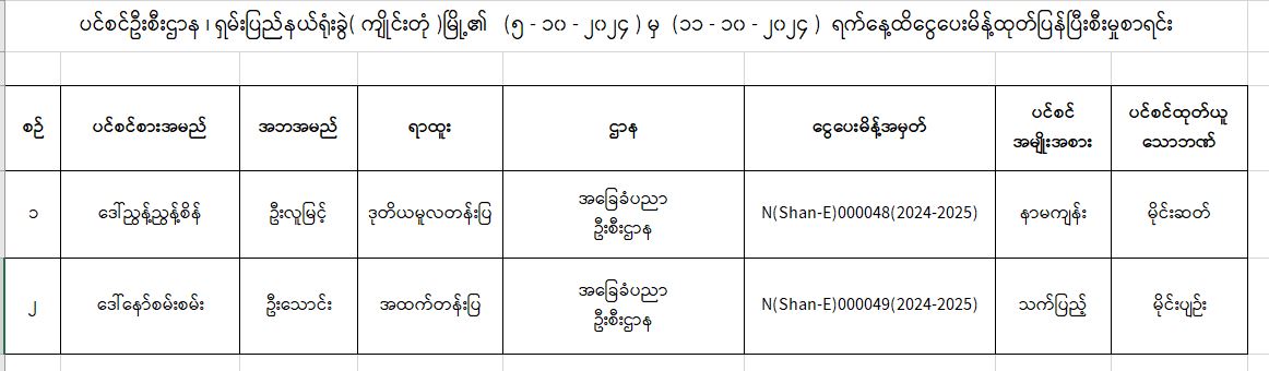 ပင်စင်ဦးစီးဌာန၊ ရှမ်းပြည်နယ်ရုံးခွဲ(ကျိုင်းတုံမြို့)၏ ငွေပေးမိန့်ထုတ်ပြန်မှုစာရင်း (၅-၁၀-၂၀၂၄ မှ ၁၁-၁၀-၂၀၂၄) pdfinance_editor Tue, 10/15/2024 - 15:13