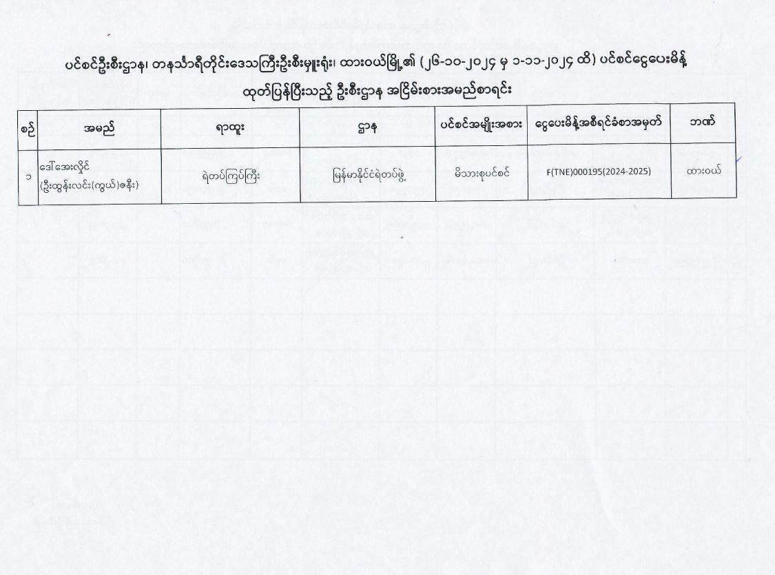 ပင်စင်ဦးစီးဌာန၊ တနင်္သာရီတိုင်းဒေသကြီးဦးစီးမှူးရုံး၏ ငွေပေးမိန့်ထုတ်ပြန်မှုစာရင်း (၂၆-၁၀-၂၀၂၄ မှ ၁-၁၁-၂၀၂၄)
