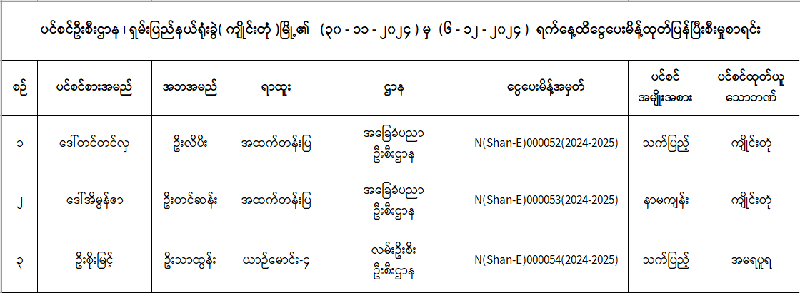 ပင်စင်ဦးစီးဌာန၊ ရှမ်းပြည်နယ်ရုံးခွဲ(ကျိုင်းတုံမြို့)၏ ငွေပေးမိန့်ထုတ်ပြန်မှုစာရင်း (၃၀-၁၁-၂၀၂၄ မှ ၆-၁၂-၂၀၂၄) pdfinance_editor Fri, 12/27/2024 - 12:49