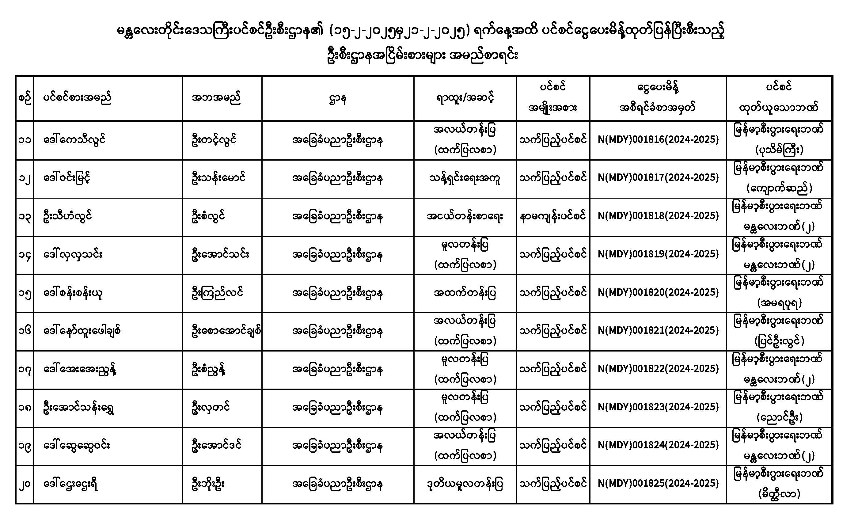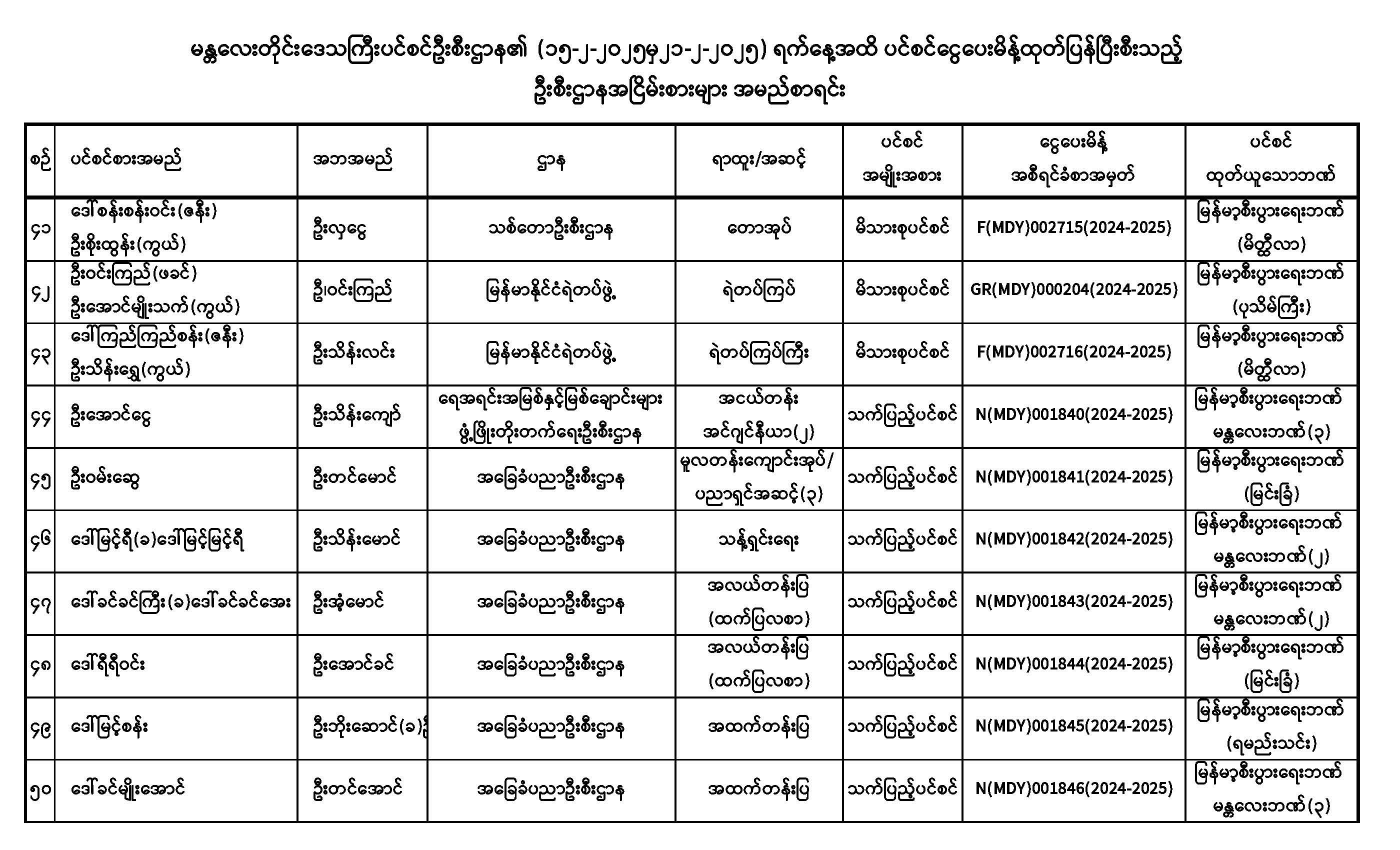 ပင်စင်ဦးစီးဌာန၊ မန္တလေးတိုင်းဒေသကြီးဦးစီးမှူးရုံး၏ ငွေပေးမိန့်ထုတ်ပြန်မှုစာရင်း (၁၅-၂-၂၀၂၅ မှ ၂၁-၂-၂၀၂၅