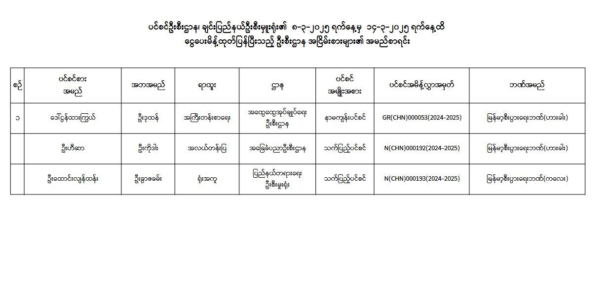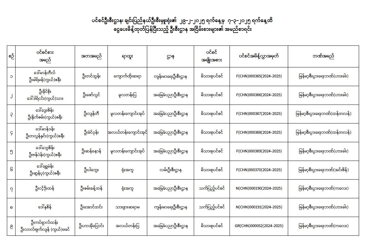 ပင်စင်ဦးစီးဌာန၊ ချင်းပြည်နယ်ဦးစီးမှူးရုံး၏ ငွေပေးမိန့်ထုတ်ပြန်မှုစာရင်း (၂၉-၂-၂၀၂၅ မှ ၁၄-၃-၂၀၂၅) pdfinance_editor Wed, 03/26/2025 - 13:29