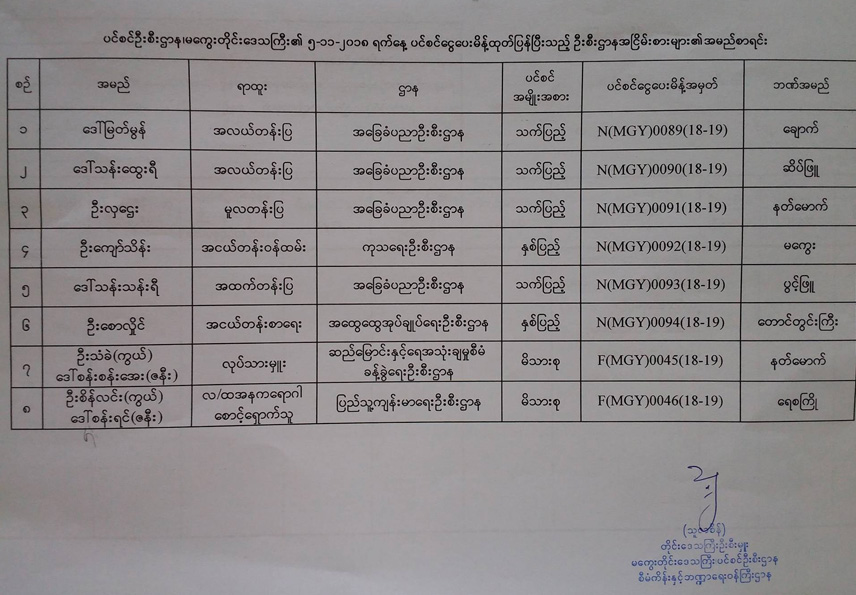 ပင်စင်ဦးစီးဌာန၏ ၅-၁၁-၂၀၁၈ ရက်နေ့ ပင်စင်ငွေပေးမိန့်ထုတ်ပြန်ပြီးသည့် ဦးစီးဌာနအငြိမ်းစားများ၏ အမည်စာရင်း