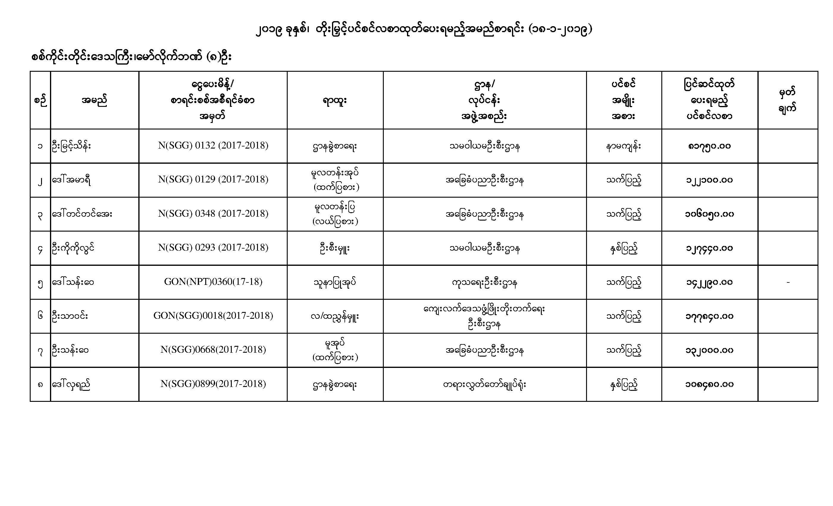 ၂၀၁၉ ခုနှစ်၊ တိုးမြှင့်ပင်စင်လစာထုတ်ပေးရမည့် အမည်စာရင်း (၁၈-၁-၂၀၁၉) စစ်ကိုင်းတိုင်းဒေသကြီး၊ မော်လိုက်ဘဏ် (၈) ဦး pdfinance_editor Tue, 01/29/2019 - 14:57 Attachment Size Maw Like-18.pdf 32.25 KB
