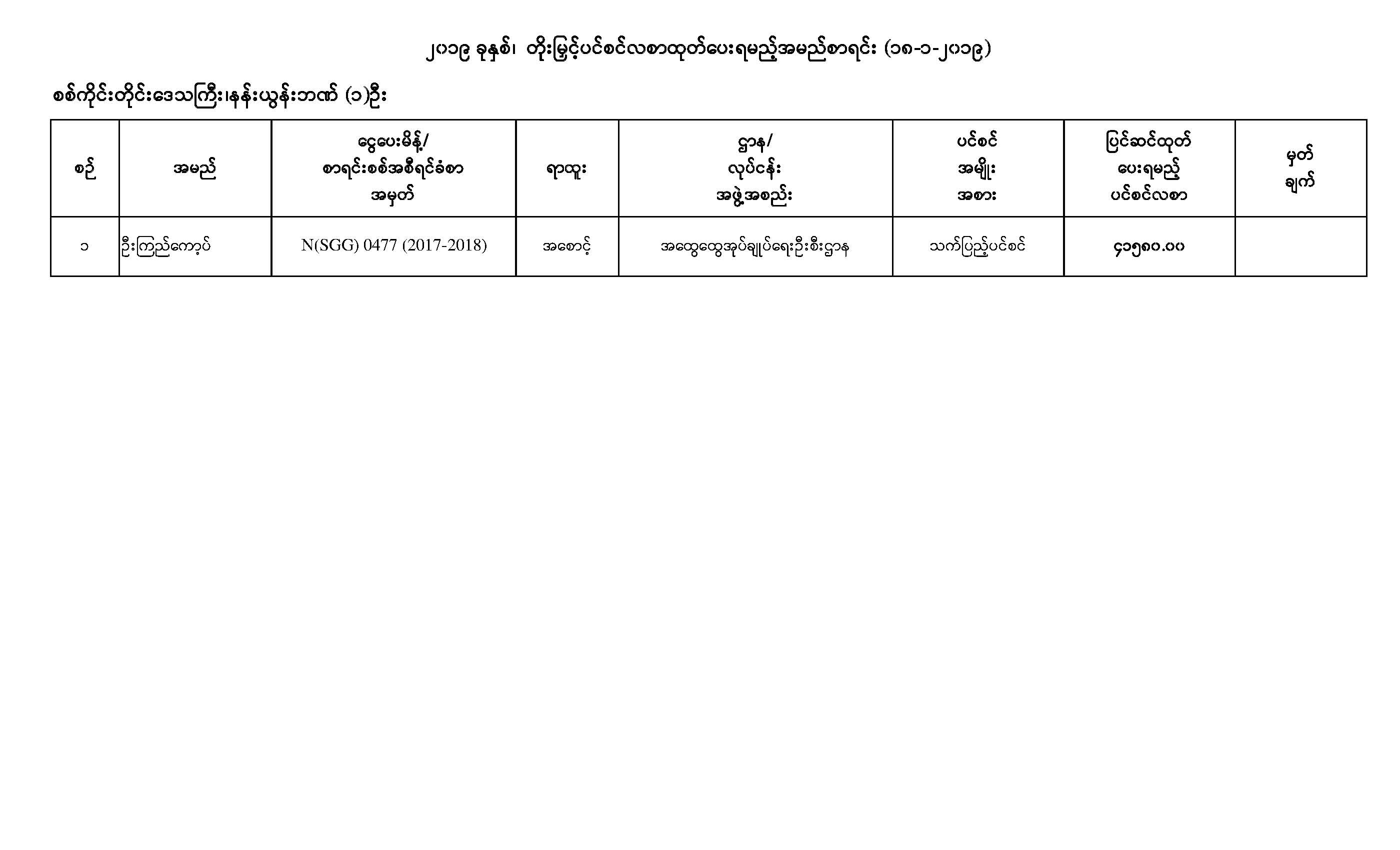 ၂၀၁၉ ခုနှစ်၊ တိုးမြှင့်ပင်စင်လစာထုတ်ပေးရမည့် အမည်စာရင်း (၁၈-၁-၂၀၁၉) စစ်ကိုင်းတိုင်းဒေသကြီး၊ နန်းယွန်းဘဏ် (၁) ဦး pdfinance_editor Tue, 01/29/2019 - 15:01 Attachment Size Nan Yon-3.pdf 26.04 KB