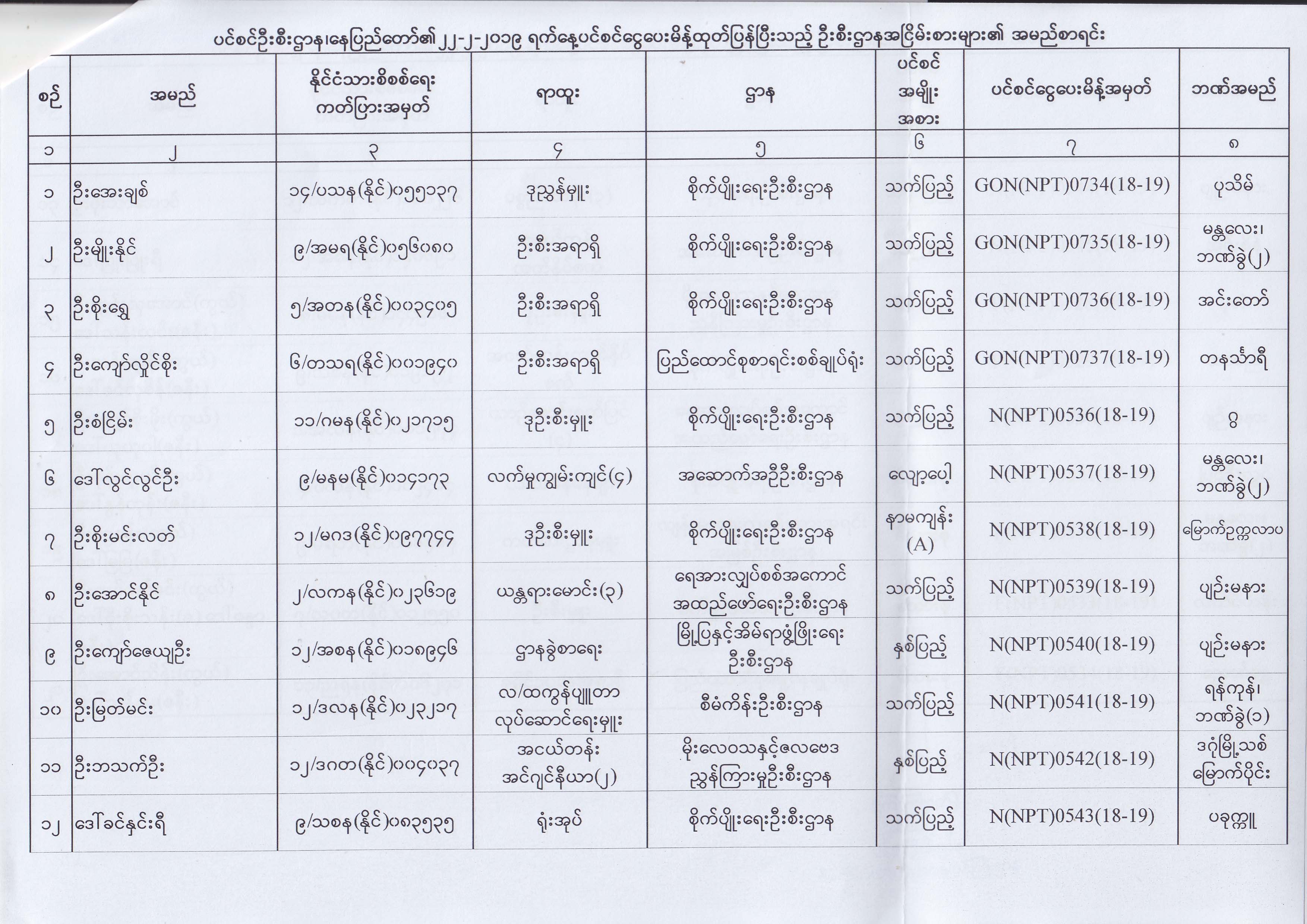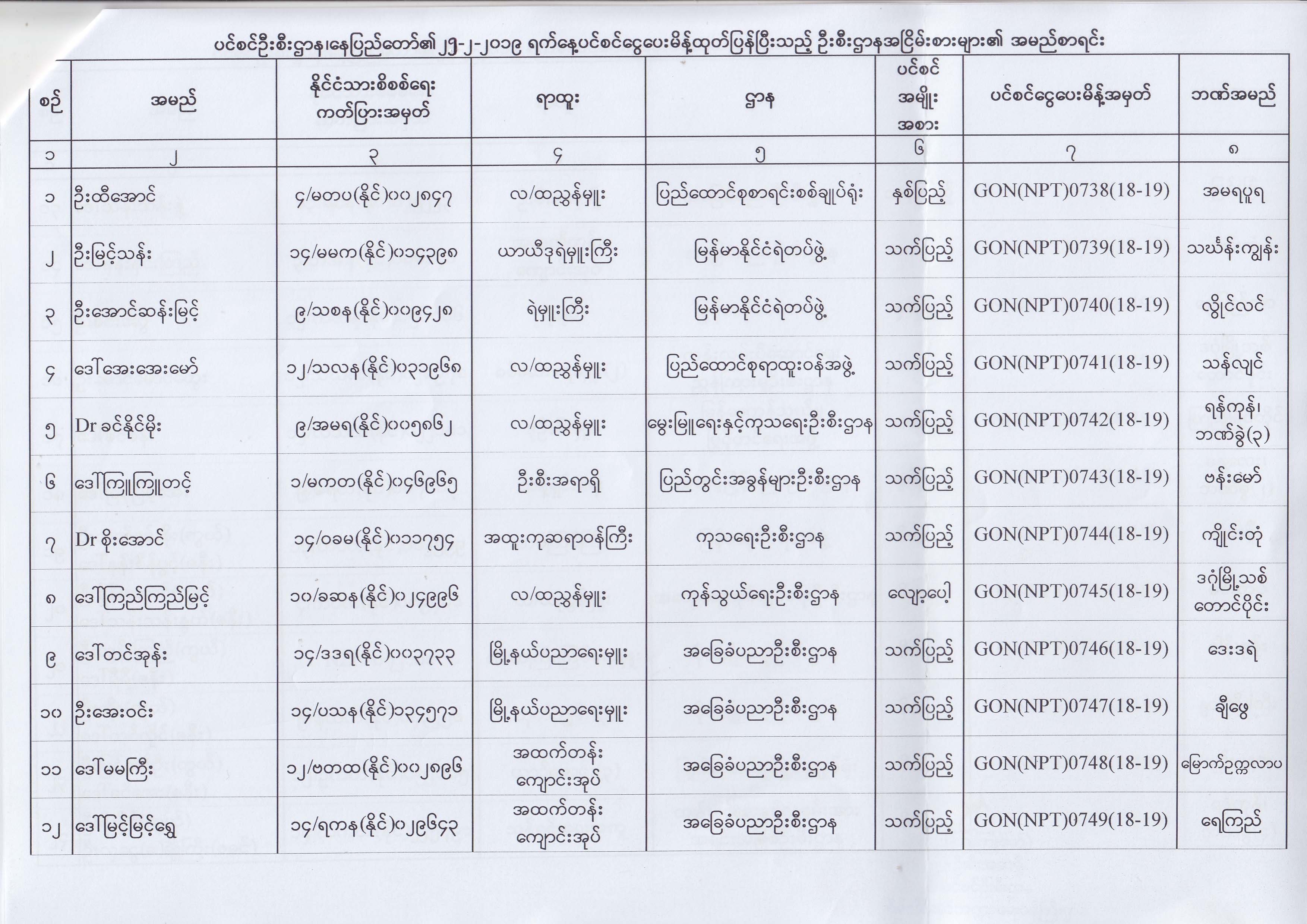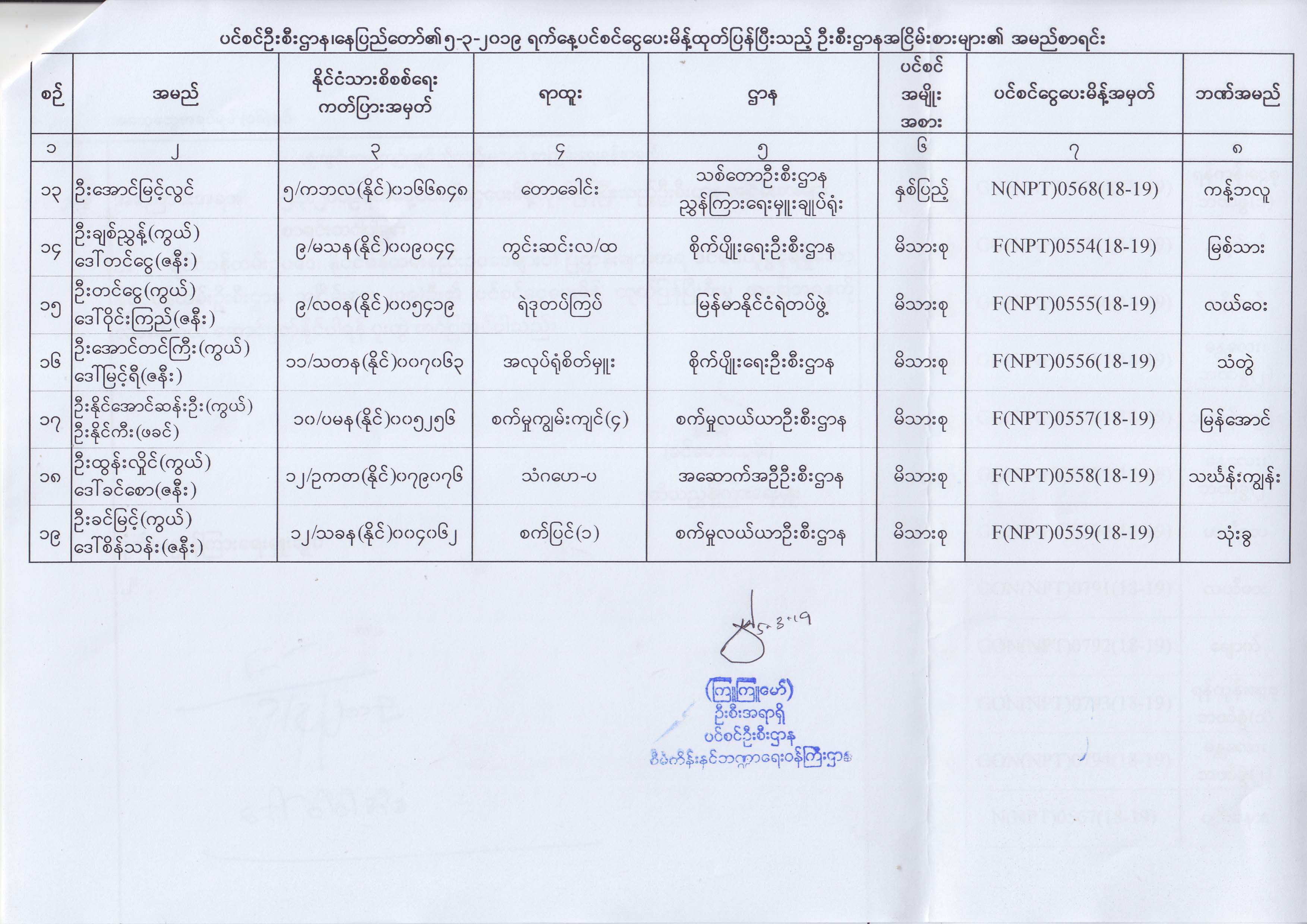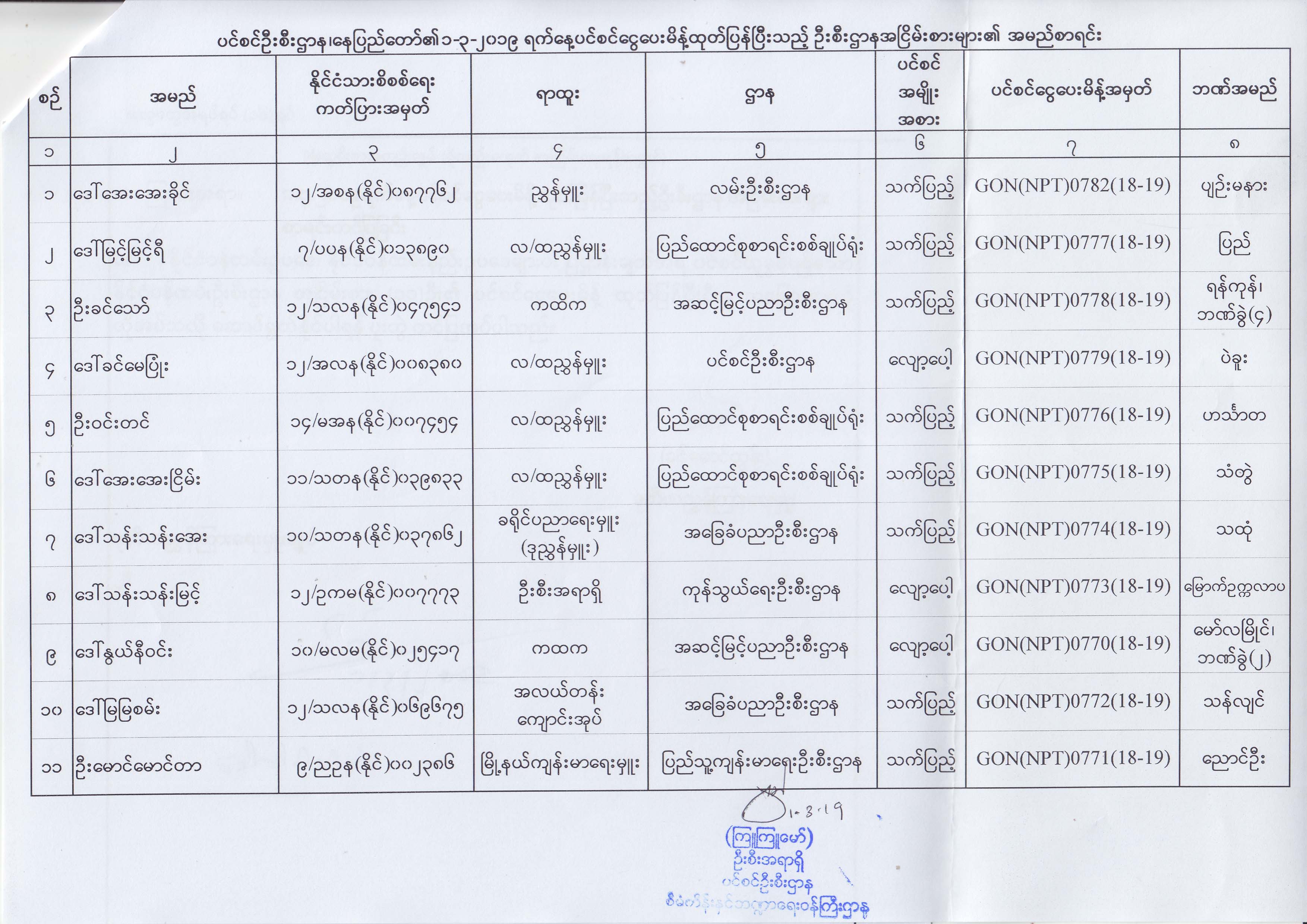 ပင်စင်ဦးစီးဌာန၊ နေပြည်တော် (ရုံးချုပ်) ၏ ၂၂-၂-၂၀၁၉ ရက်နေ့မှ ၈-၃-၂၀၁၉ ရက်နေ့အထိ ပင်စင်ငွေပေးမိန့်ထုတ်ပြန်ပြီးသည့် ဦးစီးဌာနအငြိမ်းစားများ၏ အမည်စာရင်း