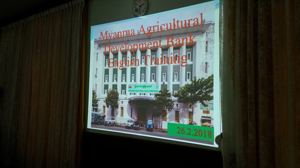 မြန်မာ့လယ်ယာဖွံ့ဖြိုးရေးဘဏ်(ရုံးချုပ်)တွင် (၂၆.၂.၂၀၁၈ မှ ၁၁.၄.၂၀၁၈)အထိဖွင့်လှစ်သည့်အင်္ဂလိပ်စာသင်တန်းသို့ အရာရှိ(၂၄)ဦးနှင့် အမှုထမ်း(၆)ဦး၊ စုစုပေါင်း(၃၀)ဦးတက်ရောက်ပြီးAmerican Institute Myanmar မှ ဆရာများ လာရောက်သင်ကြားကြပါသည်။
