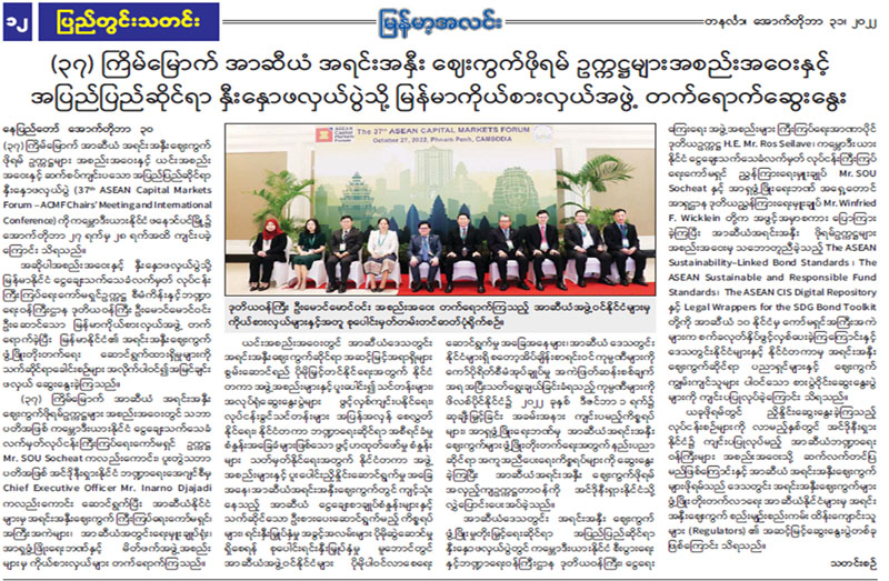 (၃၇) ကြိမ်မြောက် အာဆီယံအရင်းအနှီးဈေးကွက်ဖိုရမ်ဥက္ကဌများ အစည်းအဝေးနှင့် ယင်းအစည်းအဝေးနှင့် ကျင်းသောဆိုင်ရာနှီးနှောပွဲ (37th ASEAN Capital Market Forum- ACMF Chairs' Meeting and International Conference) ကို ကမ္ဘောဒီးယား၊ ဖနောမြို့၌ ၂၀၂၂ ခုနှစ်၊ အောက်တိုဘာလ ၂၇ ရက်နေ့နှင့် ၂၈ နေ့တို့တွင် ကျင်းပရာ စီမံကိန်းနှင့်ဘဏ္ဍာရေးဝန်ကြီးဌာ၊ ဒုတိယဝန်ကြီး၊ မြန်မာနိုင်ငံငွေချေးသက်သေခံလက်မှတ်လုပ်ငန်းကြီးကြပ်ရေးကော်မရှင်၊ ဥက္ကဌ ဦးမောင်မောင်ဝင်း ဦးဆောင်သော မြန်မာကိုယ်စားတက်ရောက်ခဲ့သည်။