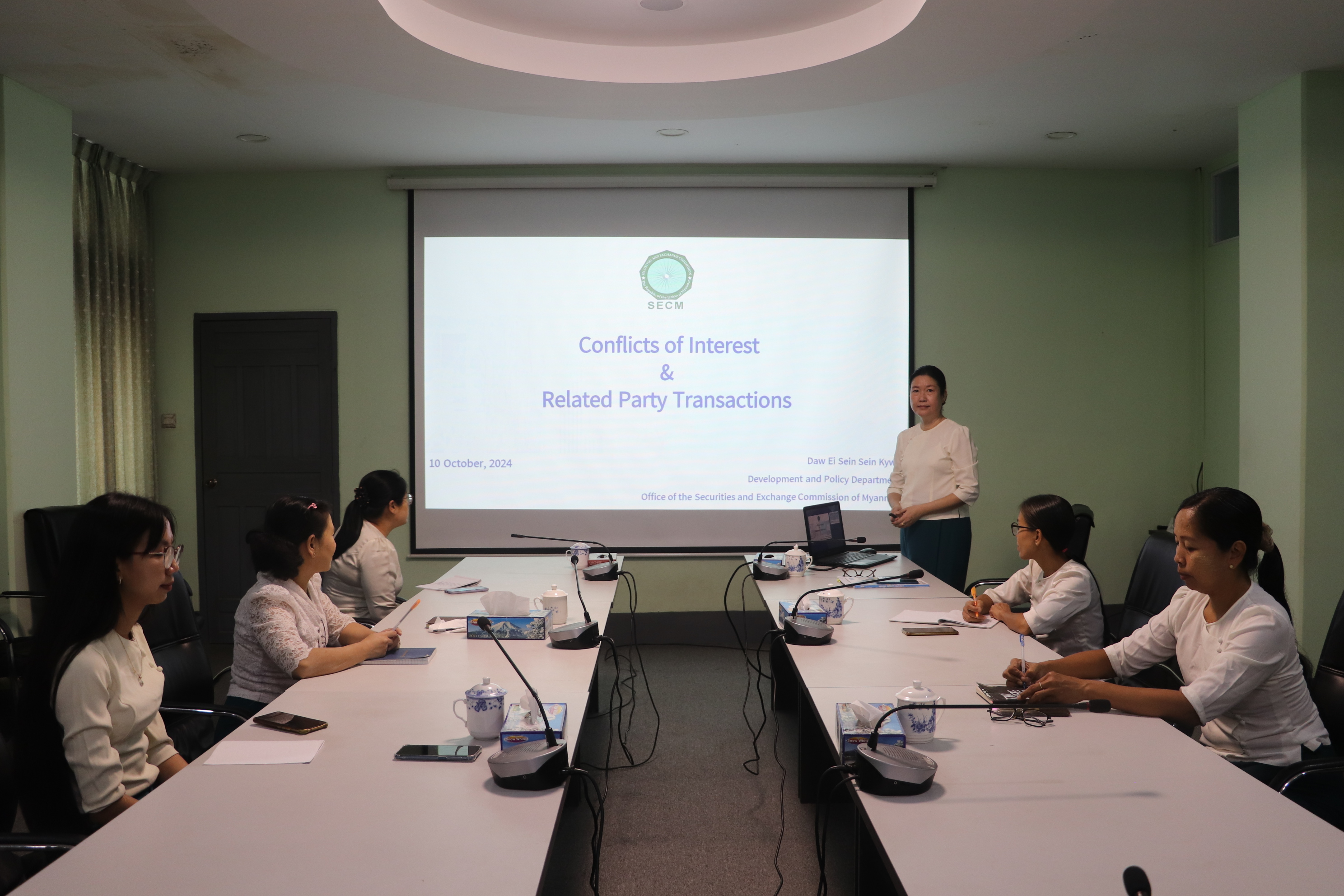 ငွေချေးသက်သေခံလက်မှတ်လုပ်ငန်းကြီးကြပ်ရေးကော်မရှင်ရုံး ဝန်ထမ်းများအတွက် အသိပညာဗဟုသုတများတိုးပွားလာစေရန် Conflicts of Interest & Related Party Transactions ခေါင်းစဉ်ဖြင့် အသိပညာပေးအစီအစဉ်ကို ၁၀-၁၀-၂၀၂၄ ရက်နေ့ မွန်းလွဲ ၂:၀၀ နာရီတွင် ညွှန်ကြားရေးမှူး ဒေါ်အိစိန်စိန်ကြွယ်မှ ရှင်းလင်းပို့ချခဲ့ပြီး ကော်မရှင်ရုံးမှအရာထမ်း၊အမှုထမ်း ၃၀ ဦးတက်ရောက်ခဲ့ကာ အခမ်းအနားကိုမွန်းလွဲ ၃:၃၀ အချိန်တွင်ရုပ်သိမ်းခဲ့ပါသည်။