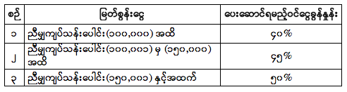 - အခြေခံသက်သာခွင့်(စုစုပေါင်းဝင်ငွေ၏ ၂၀ ရာခိုင်နှုန်း၊ ကျပ်သိန်း ၁၀၀ ထက်မပိုစေရ)